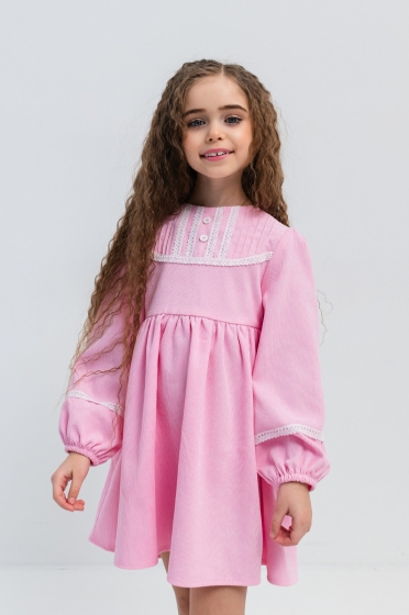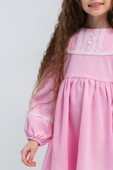 Realizată dintr-un material ușor și plăcut la atingere, această rochie copii roz oferă confort și libertate de mișcare. Croiala lejeră, ușor evazată, este completată de detalii fine precum pliurile decorative din partea superioară și inserțiile delicate de dantelă, care adaugă un plus de eleganță.