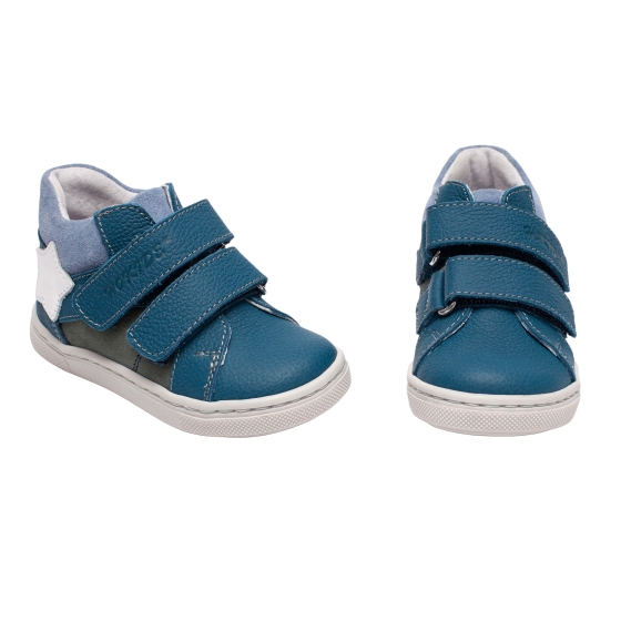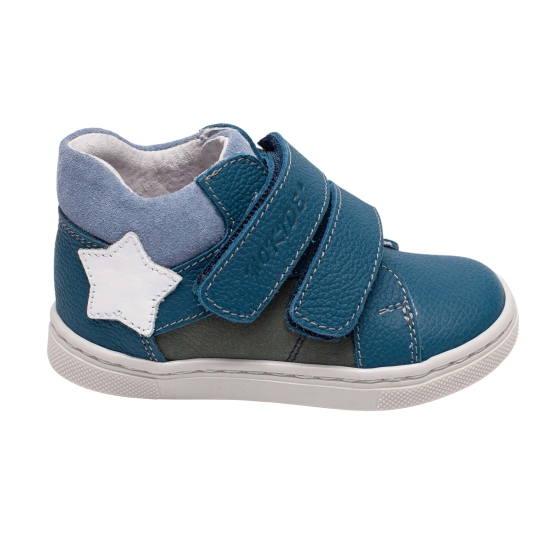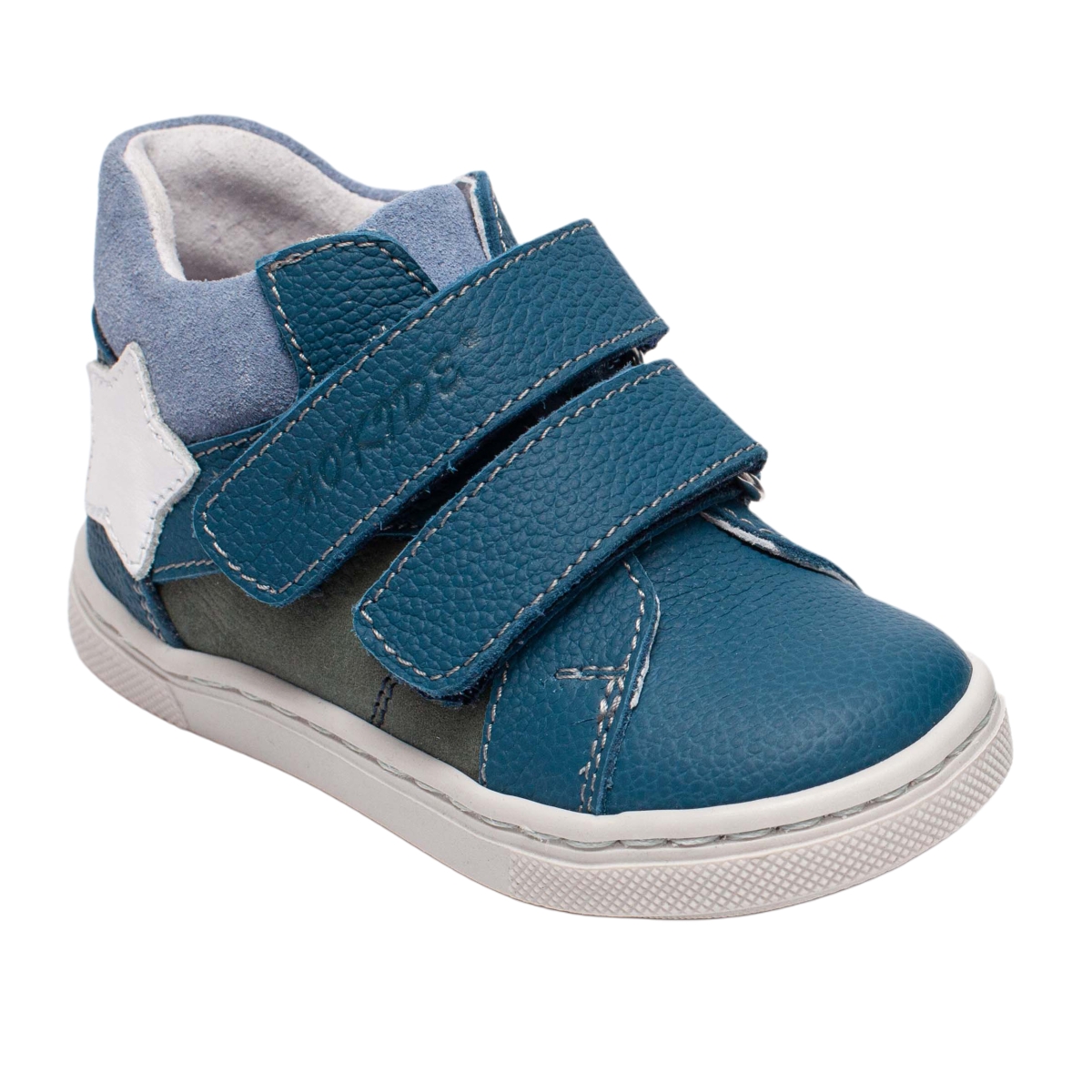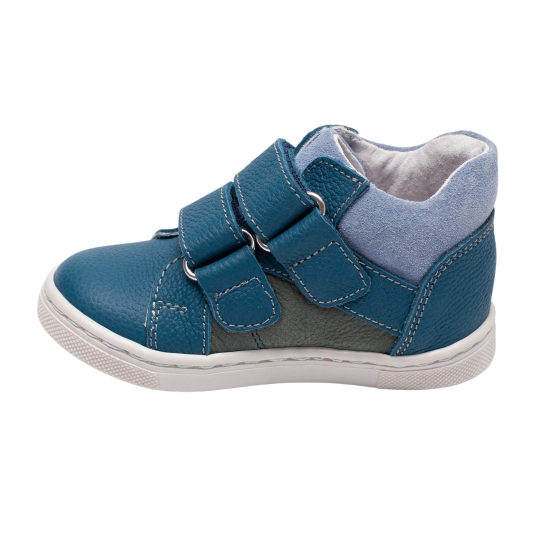 Ghete băieți ortopedice din piele naturală cu talonet Hokide 442 blu alb. Încălțăminte copii din piele naturală, confortabilă și flexibilă, ideală pentru susținerea corectă a piciorului. Mărimi 19–25.