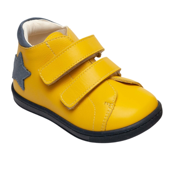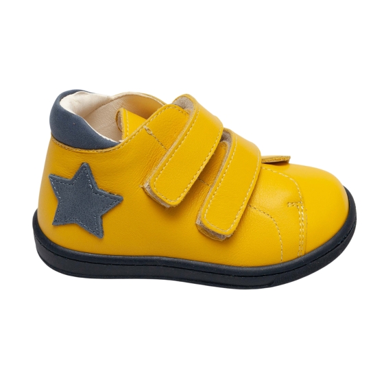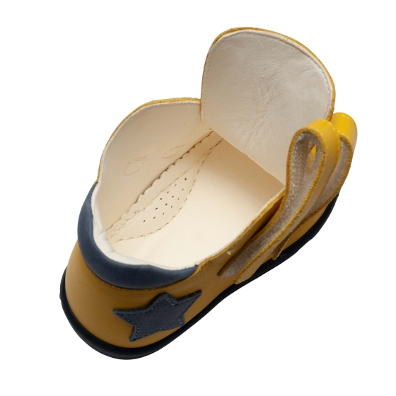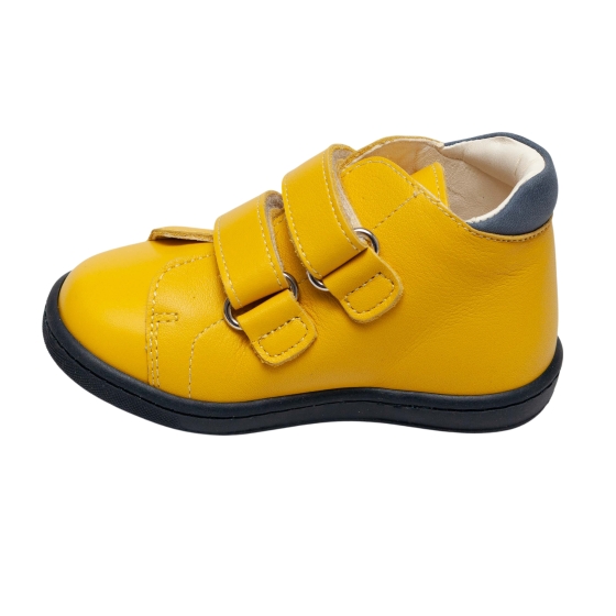 Ghete copii cu talonet ortopedic din piele naturală, model AV415 galben blu (17–30) – încălțăminte copii ortopedică, realizată din piele naturală interior și exterior pentru confort maxim. Aceste ghete cu talonet oferă susținere corectă a piciorului, fiind ideale pentru purtare zilnică. Sistem velcro, talpă flexibilă și antiderapantă pentru siguranță și stabilitate.