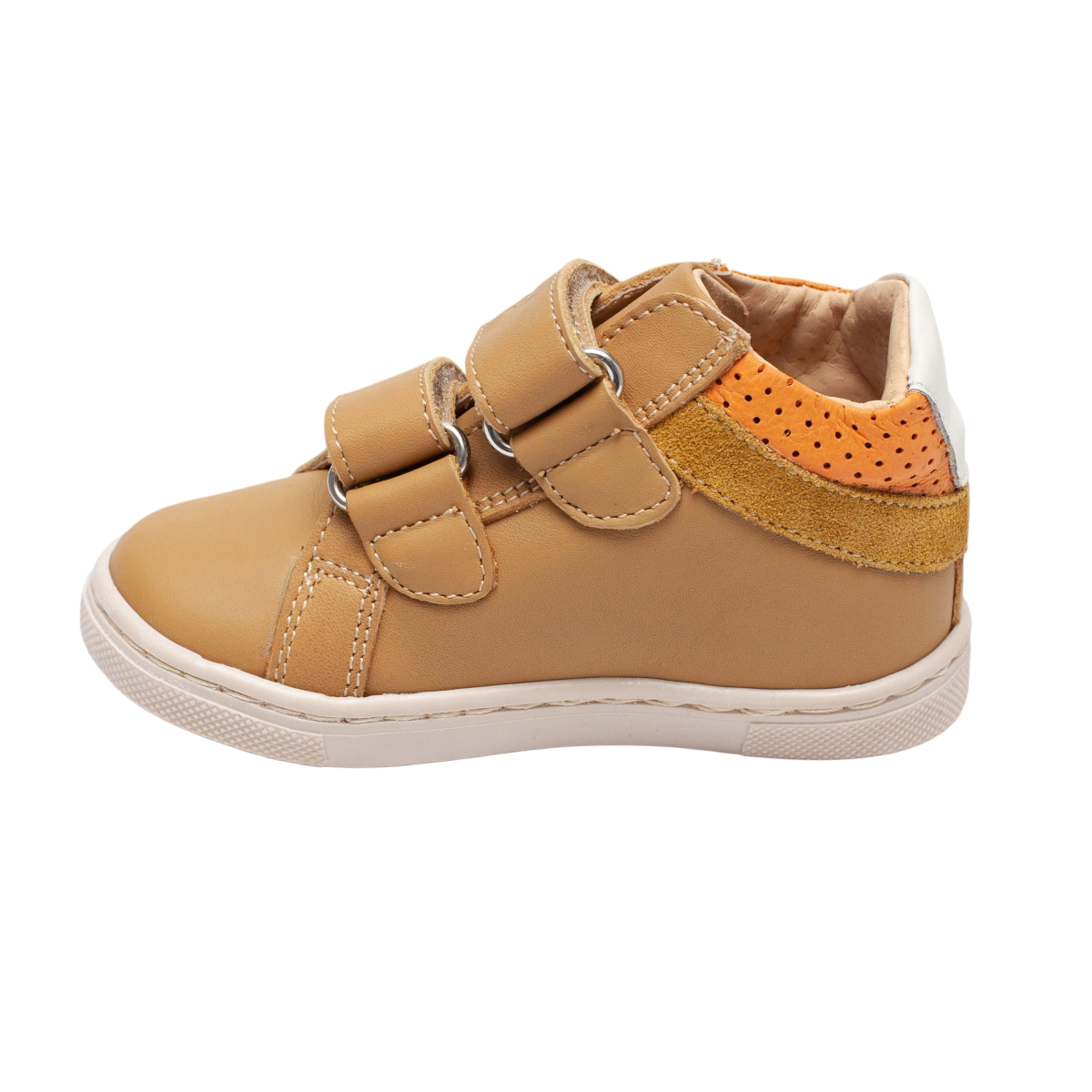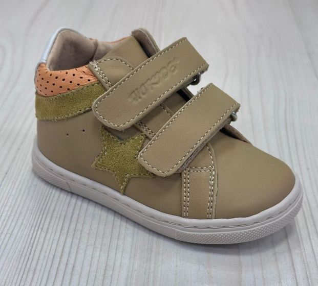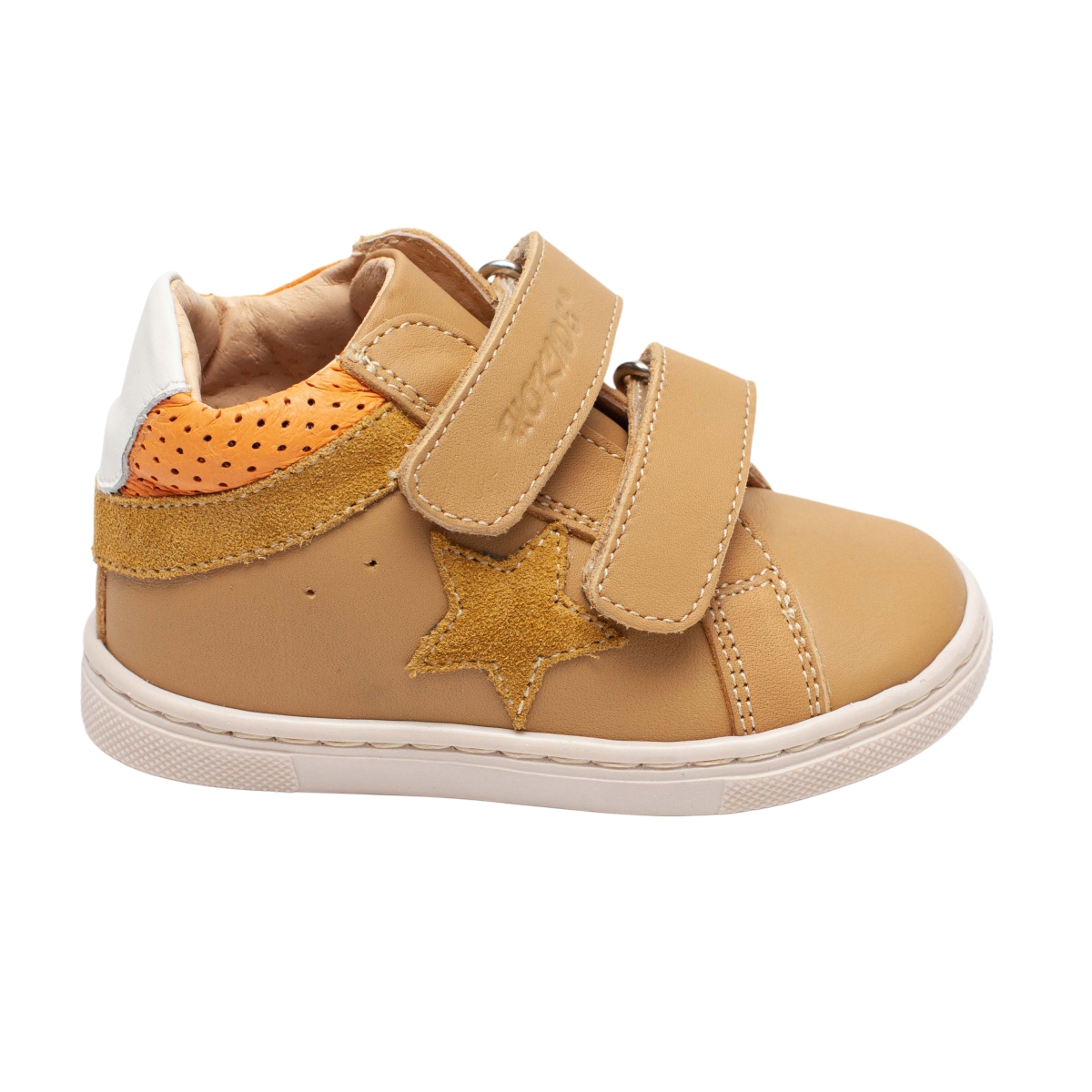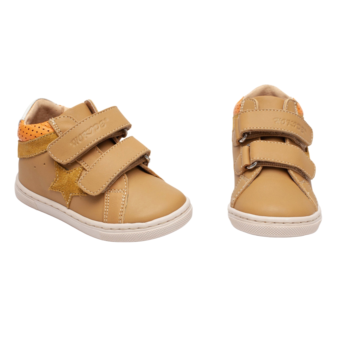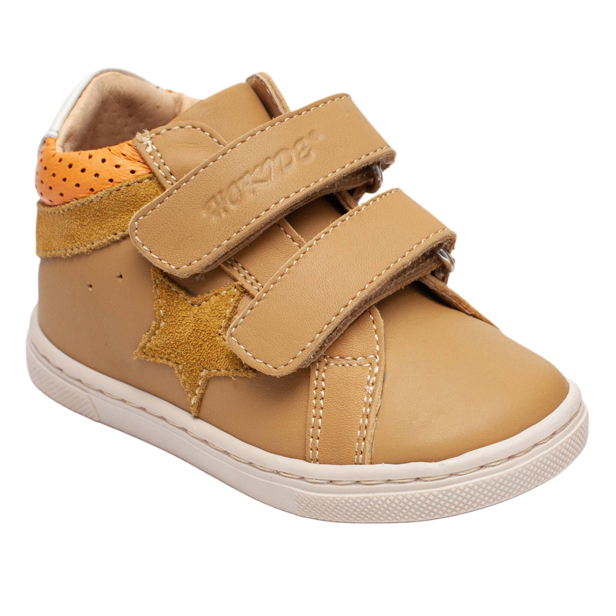 Designul modern, în nuanță bej cu detalii decorative (stea și accente portocalii), transformă aceste ghete copii într-o alegere practică și stilată, ușor de asortat.