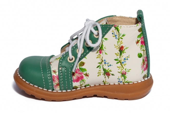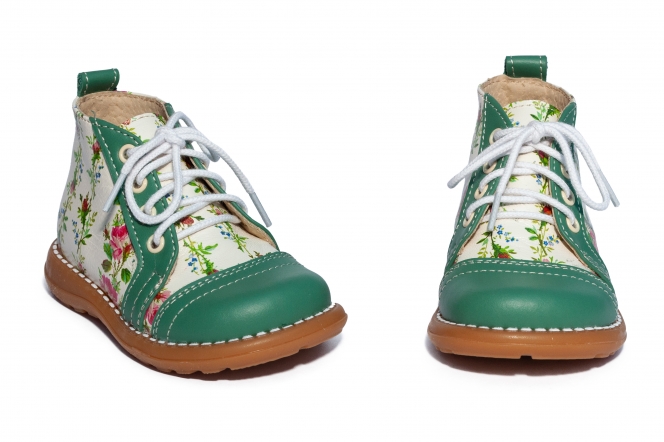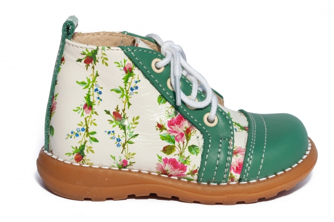 Ghete din piele alba cu floricele lateral si piele verde in varf .