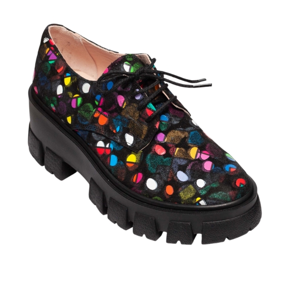 Pantofi pentru fete din piele naturală, cu talpă înaltă și design modern multicolor. Încălțăminte damă/fete comodă, rezistentă și stilată, ideală pentru ținute casual sau urbane. Pantofi din piele cu șiret, talpă groasă și aderentă, mărimi 34–40.