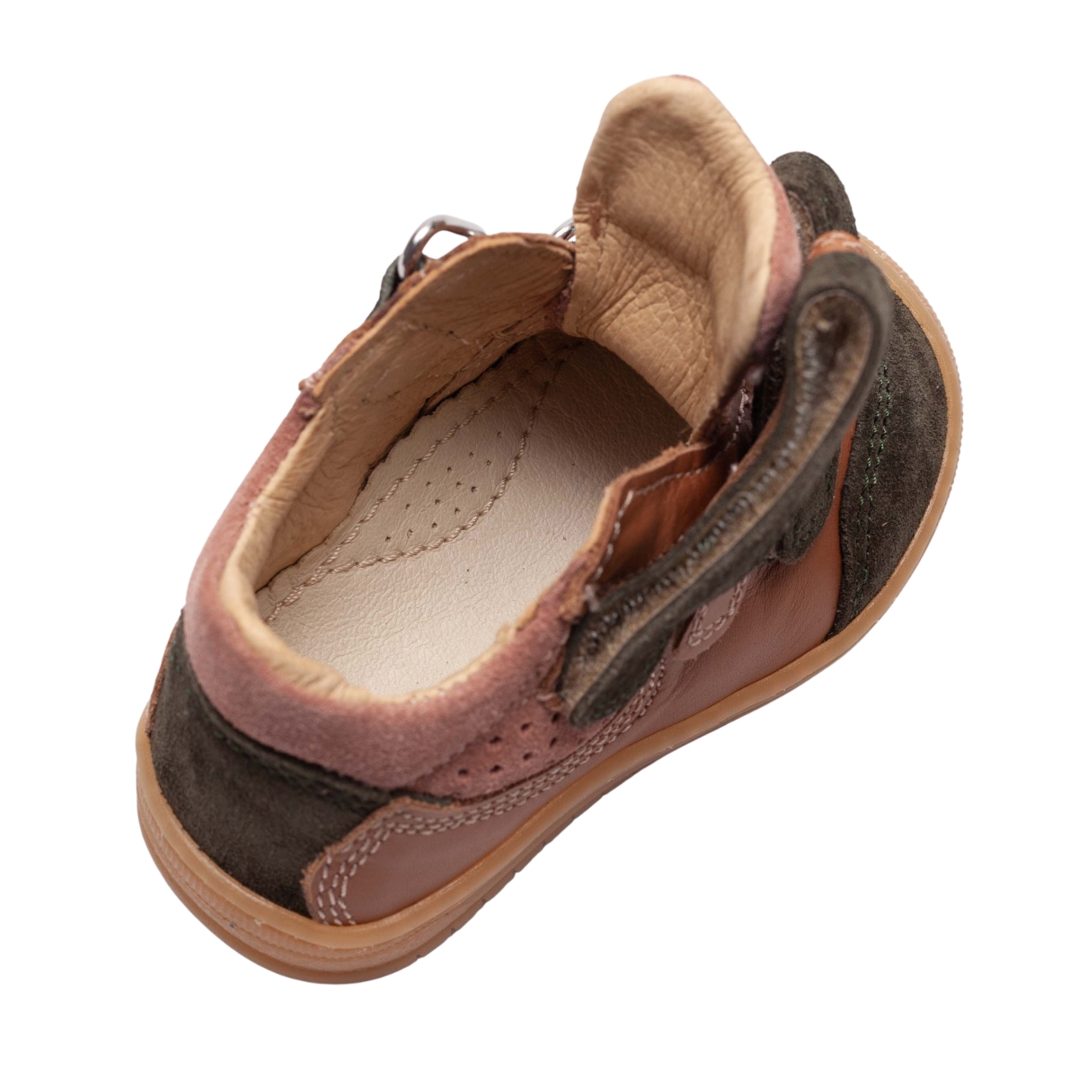 Încălțăminte ortopedică băieți din piele naturală, model 799 kaki maro, cu talonet pentru susținerea corectă a piciorului. Pantofi sport comozi, cu talpă flexibilă și închidere velcro, ideali pentru purtare zilnică (mărimi 19–30). Perfecți pentru dezvoltarea sănătoasă și confortul copiilor activi.
