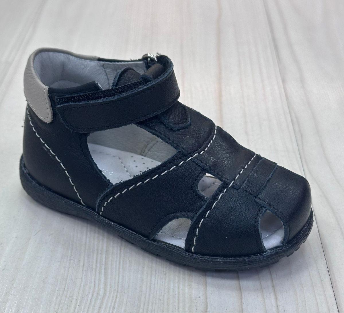 Sandale copii din piele naturală cu talonet AV38 negru gri, mărimi 17–30. Sandale fete și sandale băieți, confortabile, ideale pentru mers corect și sezonul cald.