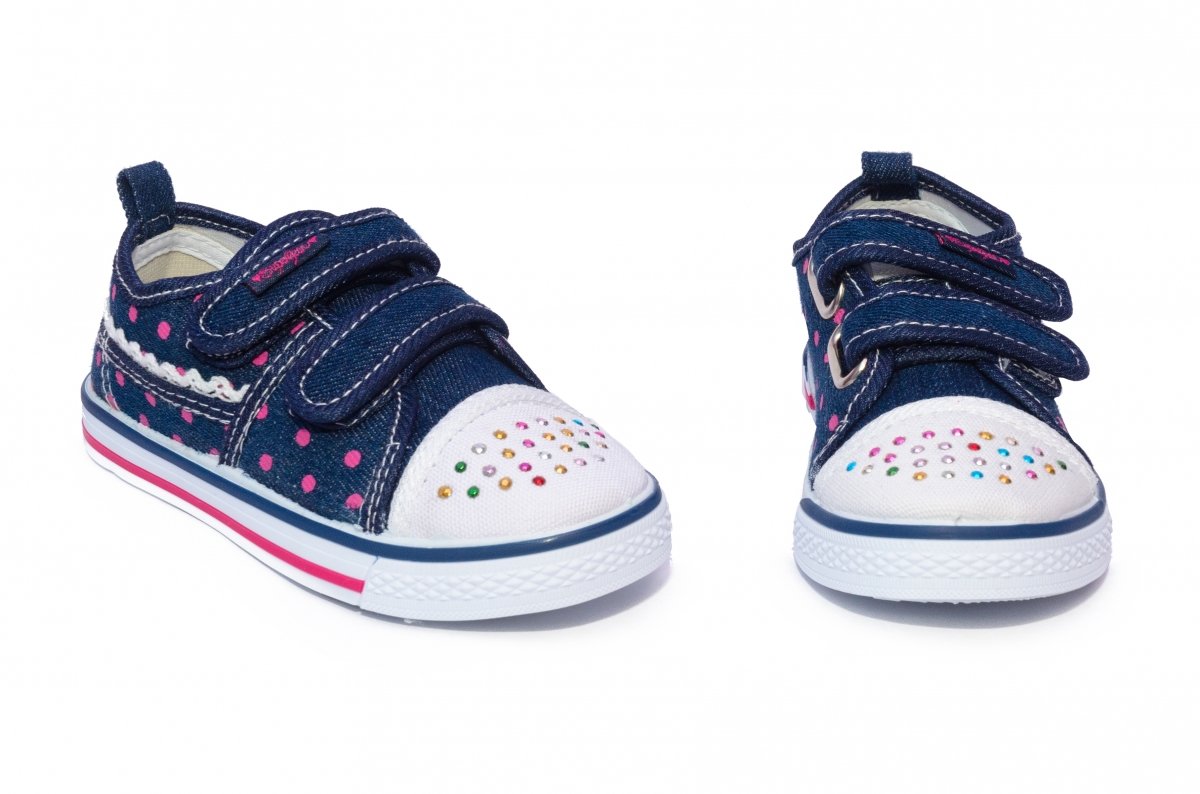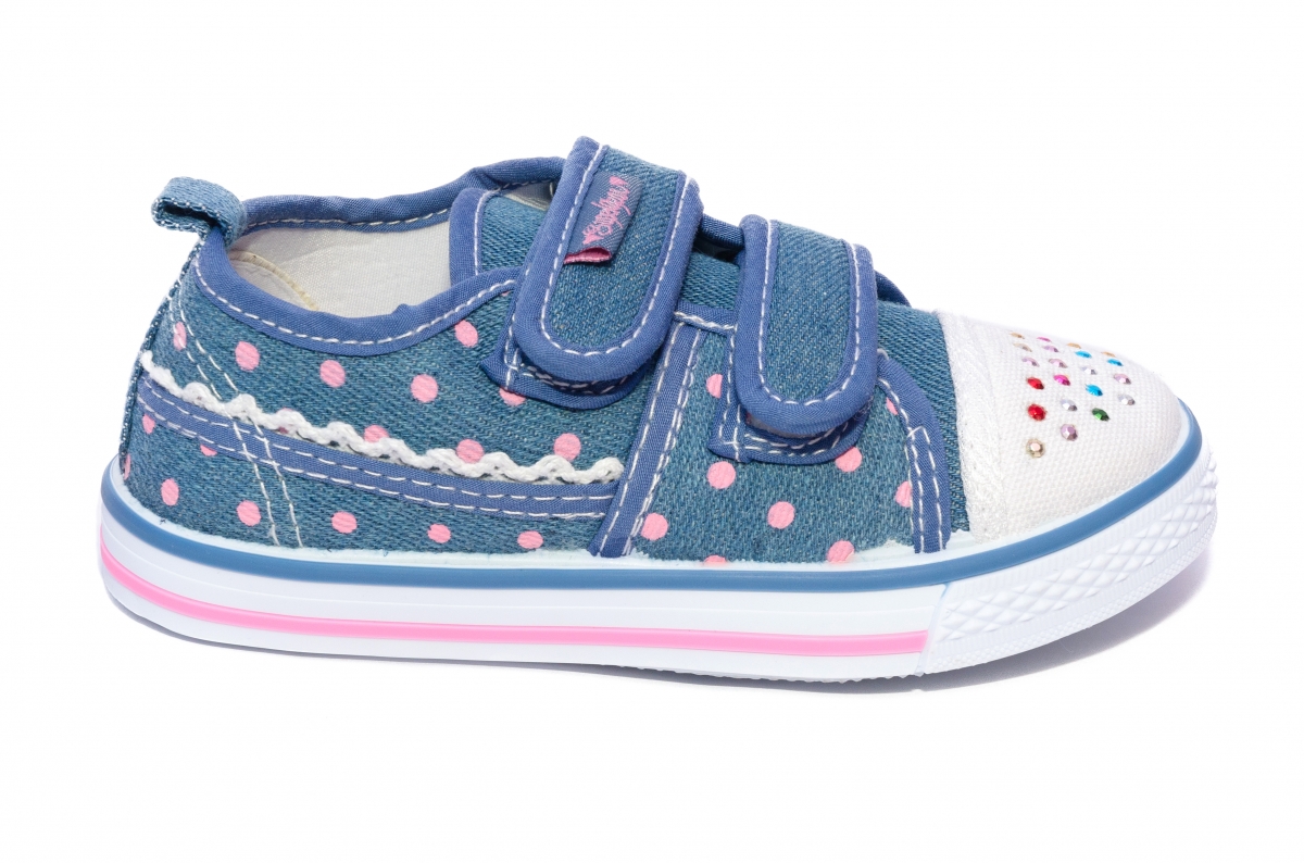 - Tenisi blu cu buline roz, strasuri pe varf si deschidere pe doi arici.